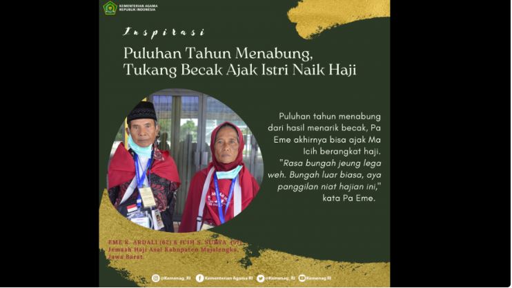 Siapa sangka, Eme yang sehari-hari bermata pencaharian sebagai penarik becak dan mangkal di depan Kantor Pos Kadipaten Kabupaten Majalengka ini, dapat mengajak sang belahan jiwa beribadah haji ke tanah suci.
