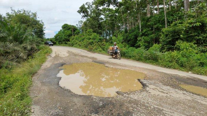 Tak jauh dari lokasi ini, terdapat dua titik badan jalan berkubang dan digenangi air sehingga sulit dilalui kendaraan.