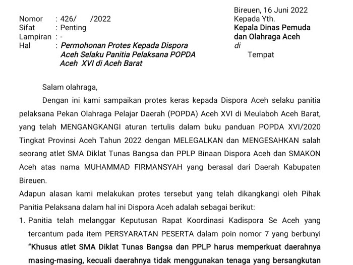 "Panitia telah menjilat kembali air ludahnya sendiri dengan menarik kembali pernyataan dan ketentuan yang telah mereka sampaikan pada saat Rakor Kadispora Se Aceh di Takengon dengan mengalihkan ketentuan-ketentuan lain yang tidak dimiliki oleh Bireuen sebagai kelengkapan persyaratan untuk atlet tersebut (Video Rakor ada dan dapat kami buktikan)," tulis Disporapar Bireuen dalam surat protesnya.