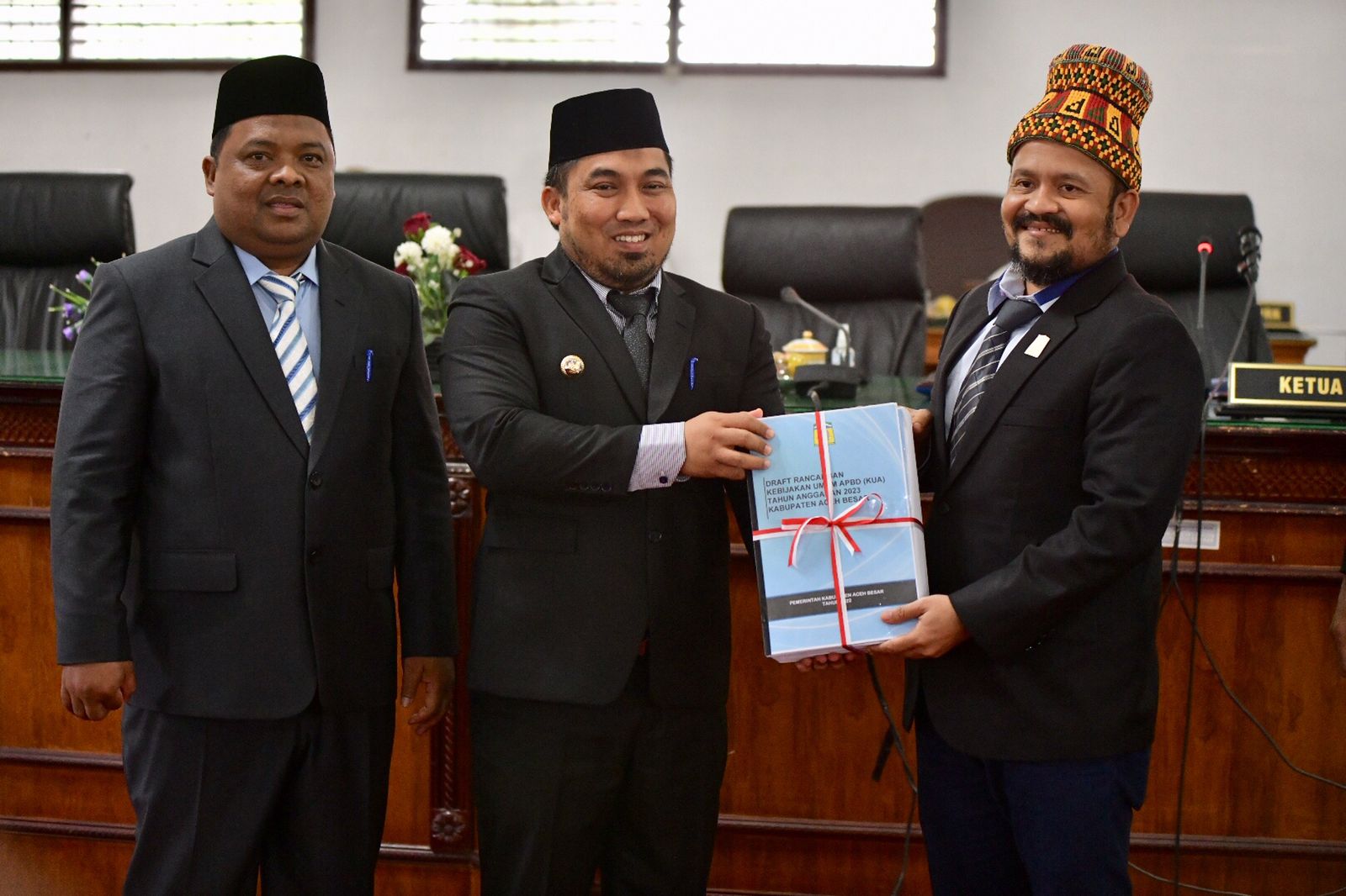 JANTHO - Penjabat (Pj) Bupati Aceh Besar Muhammad Iswanto menyerahkan rancangan Kebijakan Umum Anggaran dan Prioritas Plafon Anggaran Sementara (KUA PPAS) kepada Ketua DPRK Aceh Besar, Iskandar Ali, pada rapat paripurna, Senin (1/8/2022).