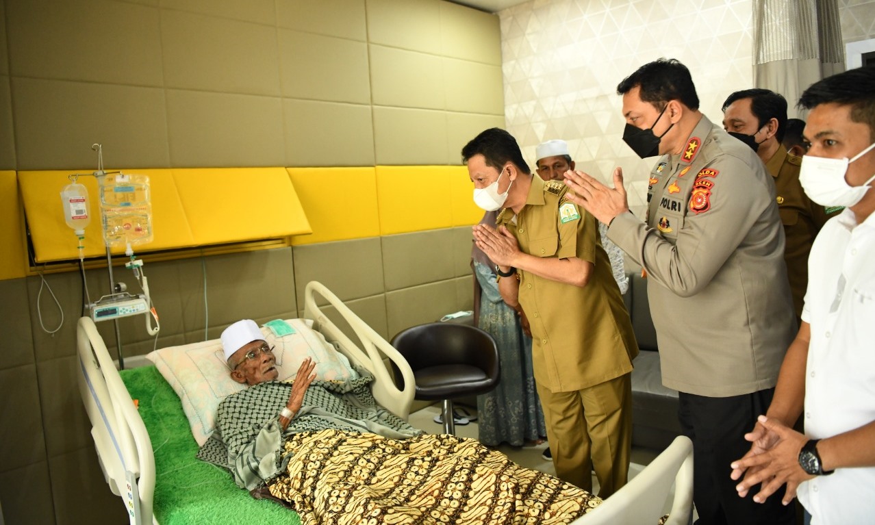 SERAMBINEWS.COM, BANDA ACEH - Penjabat (Pj) Gubernur Aceh, Achmad Marzuki, dan Kapolda Aceh, Irjen Pol Achmad Haydar mengunjungi ulama kharismatik Aceh, Teungku Muhammad Amin Mahmud atau lebih dikenal dengan sebutan Abu Tumin Blang Bladeh yang sedang dirawat di Rumah Sakit Umum Daerah Zainoel Abidin (RSUDZA) Banda Aceh, Selasa (30/08/2022).
