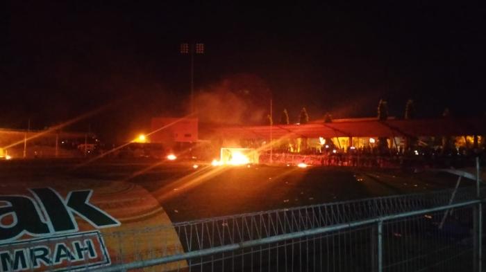 Sebelumnya, para penonton tersebut membakar berupa spanduk, triplek dan sejumlah papan reklame sponsor yang berada di pinggiran lapangan.