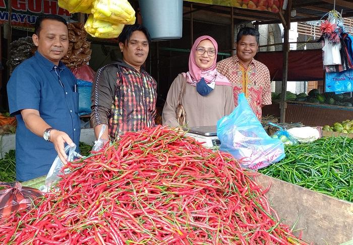 Direktur Distribusi dan Cadangan Pangan Badan Pangan Nasional, Rahmi dan tim Dinas Pangan Aceh, foto di depan toko cabai merah milik Irwan di Pasar Induk Lambaro, Aceh Besar, Jumat (30/9/2022)