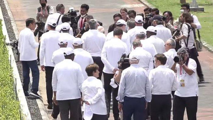Presiden Jokowi dan para tamu negara hampir semuanya mengenakan kaus berkerah warna putih lengan panjang dengan logo G20 di dada kiri.