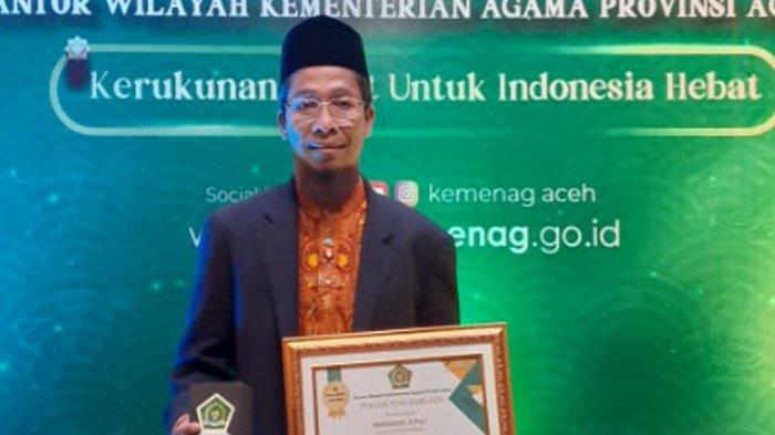 Selanjutnya, menerima Anugerah Kakanwil Kemenag Aceh Awards atas torehan prestasi juara pertama nasional Guru PAI Berdedikasi Daerah Terpencil yang be