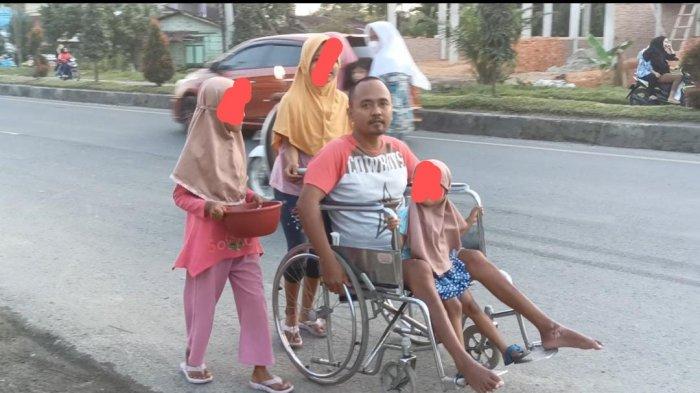 Sedangkan dua anak lainnya mendorong kursi roda mendatangi satu per satu warung kopi yang ada di Karangbaru, Aceh Tamiang.