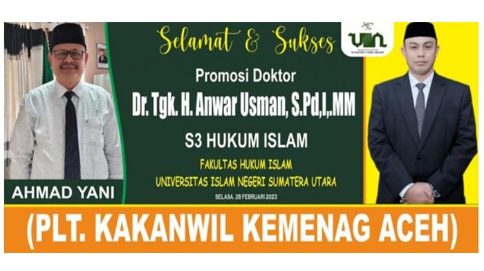 Plt Kepala Kantor Wilayah Kementerian Agama (Kakanwil Kemenag) Provinsi Aceh, Ahmad Yani SPdI mengucapkan selamat dan sukses atas sidang promosi doktor Dr Tgk H Anwar Usman SPdI MM.