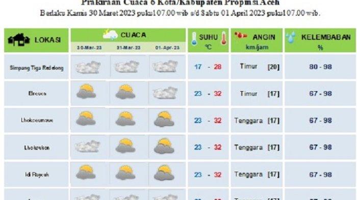 Prakiraan cuaca ini berlaku pada enam kabupaten/kota di Aceh selama tiga hari kedepan, yakni mulai Jumat (31/3/2023) besok sampai dengan Minggu (2/4/2023) nanti.