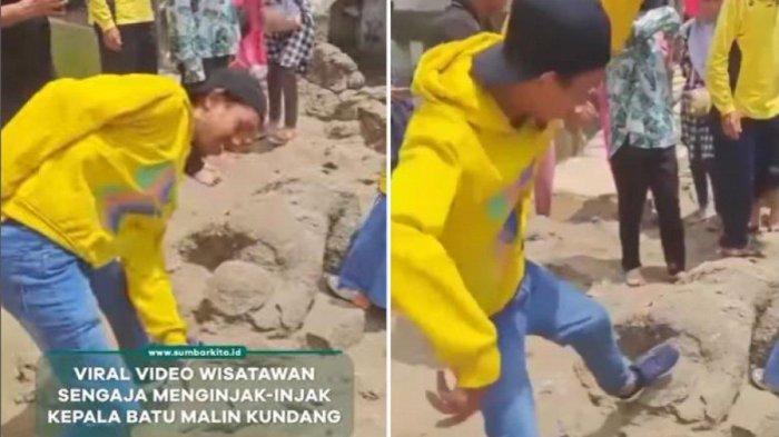 Dalam video tersebut tampak pria sangat gembira memukul dan menginjak kepala batu Malin Kundang.