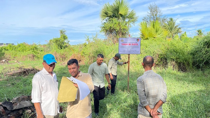 Polisi memasang papan tanda tanah disita terkait kasus korupsi pengadaan lahan untuk Zikir Nurul Arafah Islamic Center di Gampong Ulee Lheue, Kecamatan Meuraxa, Kota Banda Aceh, Selasa (20/6/2023).