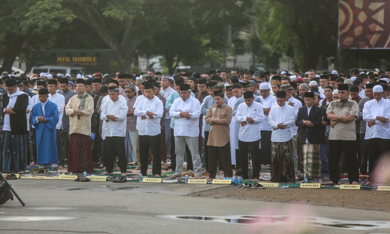 Penjabat Gubernur Aceh Achmad Marzuki, bersama Sekretaris Daerah Aceh Bustami Hamzah ikut melaksanakan Shalat Idul Adha 1444 Hinriah, bersama ribuan jamaah di Blangpadang.