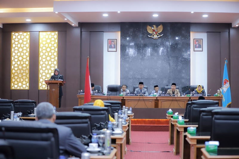 SERAMBINEWS.COM, SUKA MAKMUE - Pj Bupati Nagan Raya, Fitriany Farhas menyampaikan jawaban atas Pendapat Badan Anggaran (Banggar) dan Pandangan Umum Fraksi-fraksi Dewan terhadap Rancangan KUA PPAS APBK Tahun 2024 dalam sidang di Gedung Dewan, Jumat (25/8/2023).
