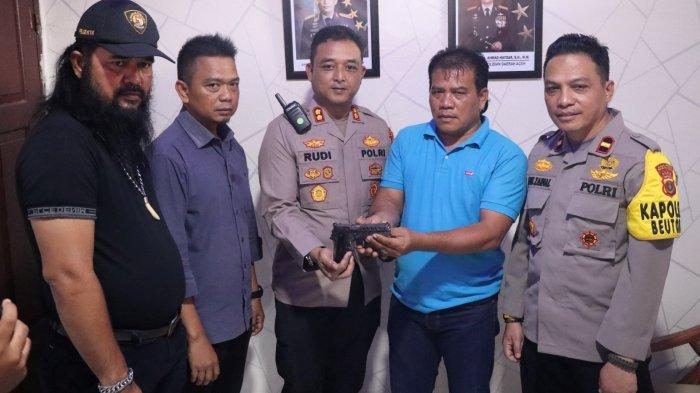 Penyerahan senpi oleh Sofyan yang diterima Kapolres Nagan Raya AKBP Rudi Saeful Hadi SIK didampingi Kapolsek Beutong Ipda Muh Zainal Dj Madas SH dan Kasat Intelkam AKP Supriadi SSos dan pimpinan Rimueng Kila Agus Salim (Cek Guh) berlangsung di Polsek Beutong.