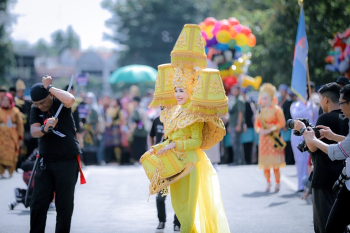 Kontingen Nagan Raya juga menampilkan putri yang berpakaian adat dalong yang merupakan salah satu ciri khas adat budaya di Nagan Raya.