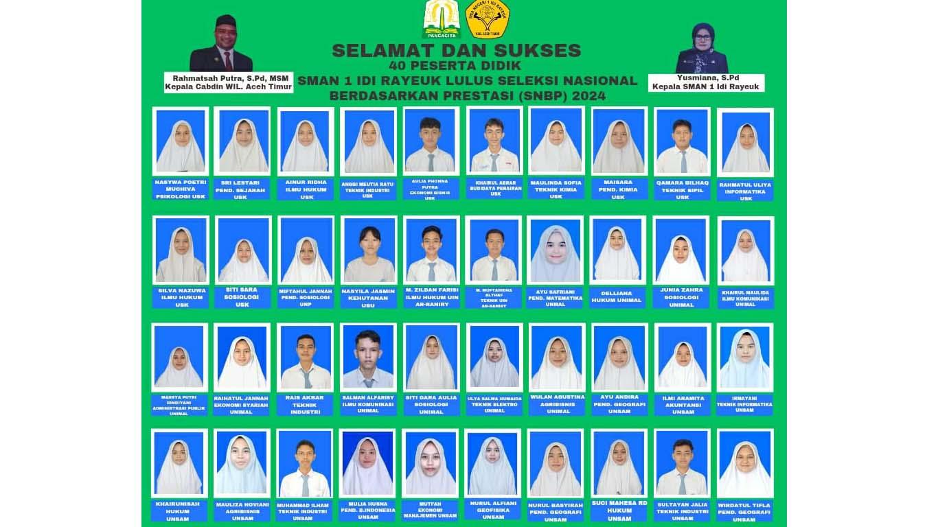 Kepala SMA Negeri 1 Idi Rayeuk, Yusmiana kepada serambinews.com, Jum'at (29/3/2024) mengatakan, kepastian 40 orang siswanya lulus SNBP melalui pengumuman dari Kemendikbudristek RI pada Selasa, (26/32024).pukul 15.00 WIB serentak se-Indonesia.