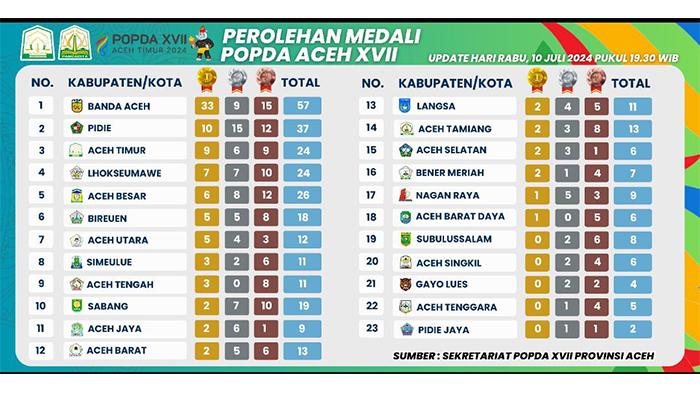 Update perolehan medali pada tanggal 10 Juli 2024, Banda Aceh memperoleh 57 keping medali.