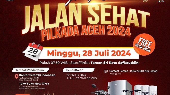 Jalan Sehat Pilkada Aceh kerjasama KIP Aceh dan Serambi Indonesia ini akan berlangsung pada, Minggu (28/7/2024), dengan mengambil start dan finish si Taman Sri Ratu Safiatuddin (Taman PKA), Banda Aceh.