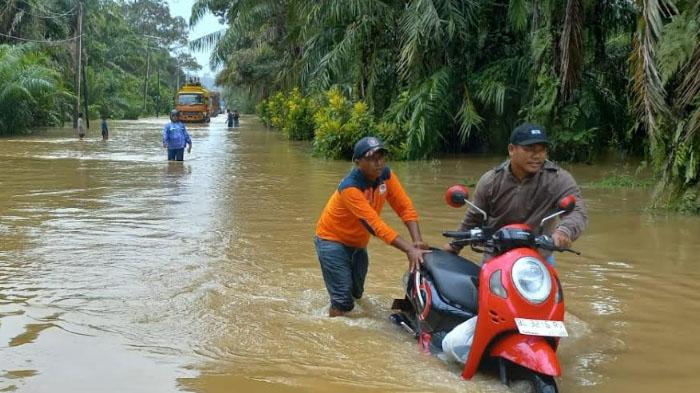 Sepeda motor didorong saat melintasi banjir yang menggenang badan jalan nasional di kawasan Silatong, Kecamatan Simpang Kanan, Aceh Singkil, Minggu (11/8/2024).