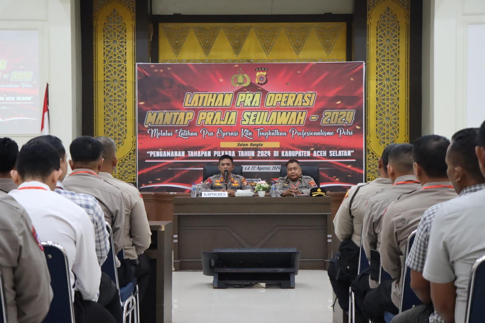 Polres Aceh Selatan Polda Aceh menyelenggarakan Latihan Pra Operasi (Latpraops) Mantap Praja Seulawah 2024 yang dibuka langsung oleh Kapolres Aceh Selatan AKBP Mughi Prasetyo Habrianto di Aula Bharadaksa Polres setempat, Selasa (20/08/2024).