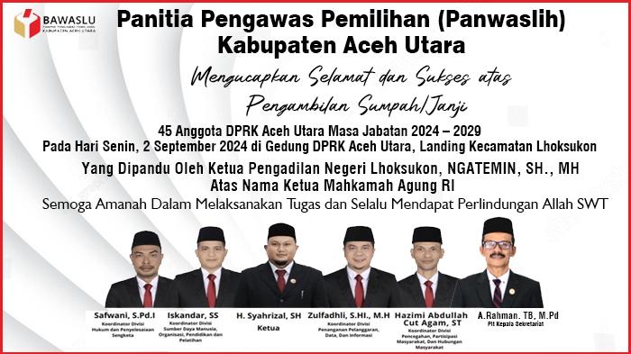 SERAMBINEWS.COM - Panitia Pengawas Pemilihan (Panwaslih) Kabupaten Aceh Utara Mengucapkan Selamat dan Sukses atas Pengambilan Sumpah/Janji 45 Anggota DPRK Aceh Utara Masa Jabatan 2024 – 2029 Pada Hari Senin, 2 September 2024 di Gedung DPRK Aceh Utara, Landing Kecamatan Lhoksukon Yang Dipandu Oleh Ketua Pengadilan Negeri Lhoksukon, NGATEMIN, SH., MH Atas Nama Ketua Mahkamah Agung RI Semoga Amanah Dalam Melaksanakan Tugas dan Selalu Mendapat Perlindungan Allah SWT
