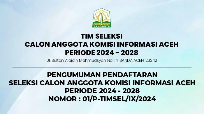 SERAMBINEWS.COM - Pemerintah Aceh melalui Tim Seleksi secara resmi mengumumkan pembukaan pendaftaran untuk calon anggota Komisi Informasi Aceh periode 2024-2028. Langkah ini merupakan bagian dari upaya untuk memenuhi amanat Undang-Undang Nomor 14 Tahun 2008 tentang Keterbukaan Informasi Publik.