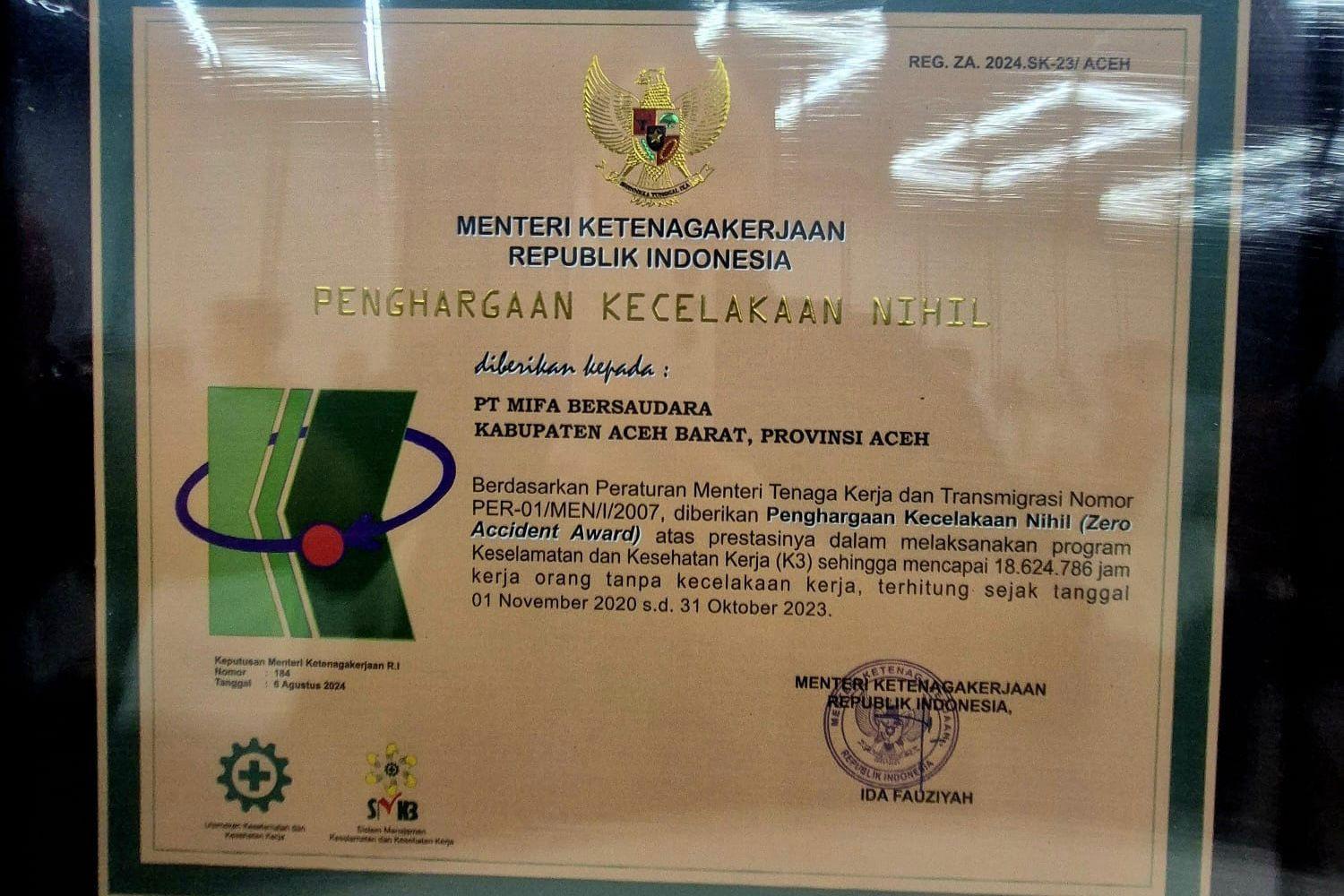 Prestasi ini diraih berkat implementasi Program Kesehatan dan Keselamatan Kerja (K3) yang berhasil mencapai 18.624.786 jam kerja orang tanpa kecelakaan kerja untuk PT Mifa Bersaudara dan 4.727.365 jam kerja orang tanpa kecelakaan kerja untuk PT Bara Energi Lestari.