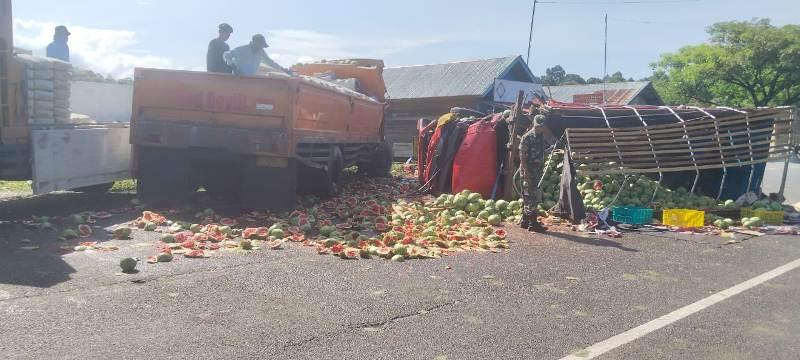 Hantam Truk Parkir, Ribuan Semangka Diangkut Colt Diesel Tumpah di Badan Jalan Nasional Aceh Jaya