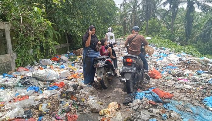 Di lokasi tersebut, tumpukan sampah plastik menutupi aspal jalan sehingga licin ketika dilintasi sepeda motor.