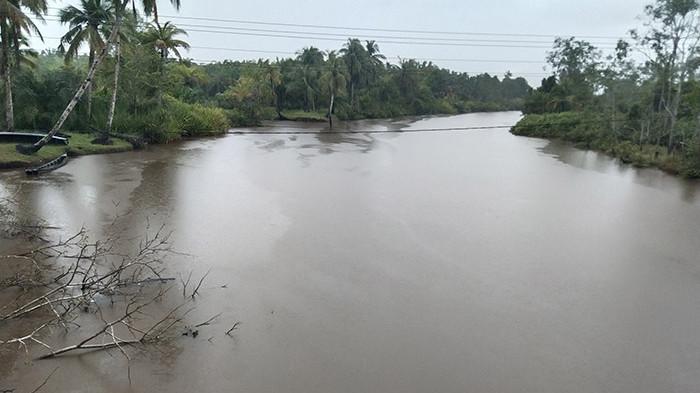SERAMBINEWS.COM, SINGKIL - Hujan deras yang mengguyur wilayah Aceh Singkil, menyebabkan volume air sungai meningkat, Jumat (1/8/2025).