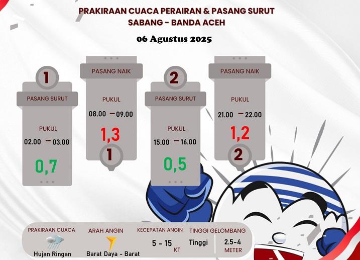 SERAMBINEWS.COM, SABANG – Stasiun Meteorologi Maimun Saleh, Sabang merilis prakiraan cuaca dan pasang surut untuk wilayah perairan Sabang–Banda Aceh pada Rabu (6/8/2025).