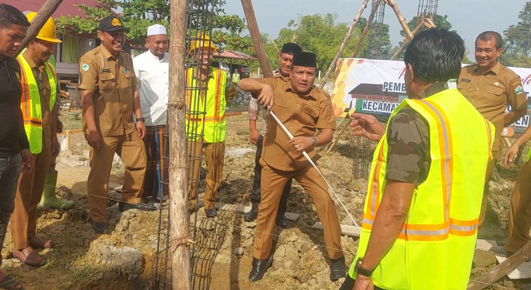 Sebelum memulai peusijuk dan peletakan batu pertama, Bupati Bireuen sempat melihat gambar bangunan dan juga mengukur kedalaman pondasi.