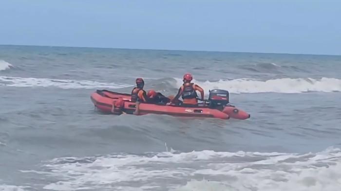 Amatan di lokasi, satu unit rubber boat tampak meluncur ke laut lepas melakukan penyisiran. Ratusan warga yang memadati bibir pantai ikut memantau jalannya pencarian.