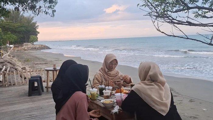 Sebuah kafe bergaya modern berdiri di atas tanggul batu gajah, menawarkan suasana santai dengan pemandangan laut lepas Selat Malaka.