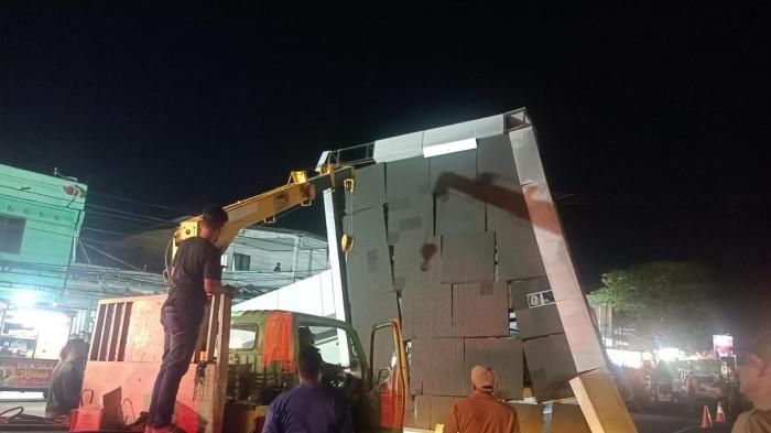 SERAMBINEWS. COM, BANDA ACEH - Sebuah papan iklan elektronik atau videotron yang berada di kawasan Simpang Surabaya, Banda Aceh, rata dengan tanah usai dirobohkan petugas Satuan Polisi Pamong Praja, Wilayatul Hisbah (Satpol PP-WH) dan Linmas Kota Banda, Rabu (19/11/2025).
