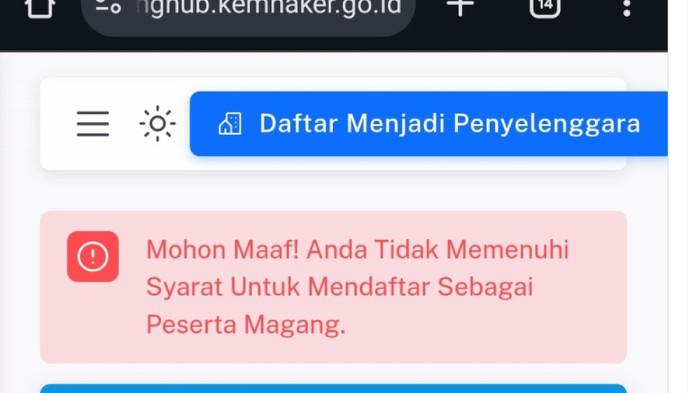 Notifikasi tersebut diterima saat melakukan pendaftaran Magang Nasional Gaji UMP di platform utama yang disediakan Kemenaker, yakni SIAPKerja.