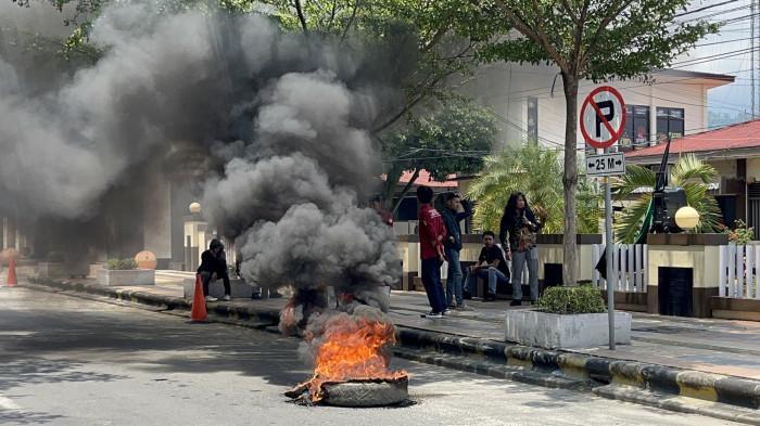 Massa juga membakar ban bekas sebagai bentuk kekecewaan atas sikap aparat kepolisian yang dinilai lamban menindak pelaku pengeroyokan.