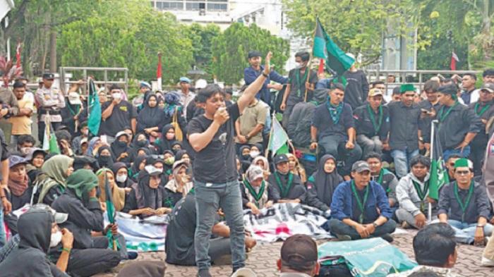 Ratusan mahasiswa alamater biru dari kampus Universitas Samudra (Unsam), Kamis (8/9/2022) kembali melakukan aksi demontrasi menolak kenaikan harga BBM