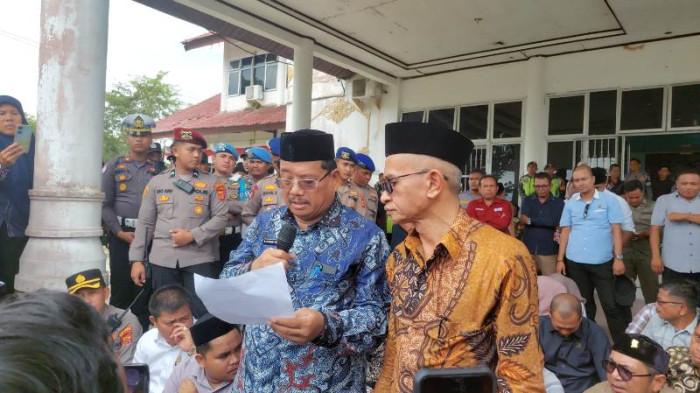 Bupati Safriadi yang semula duduk di lantai teras DPRK Aceh Singkil, mendengarkan orasi pengunjuk rasa berdiri ketika diberikan kesempatan menanggapi.